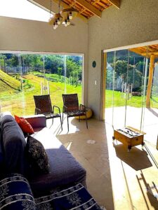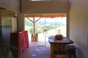 O Sítio conta com uma edificação de 80 m² no estilo rústico moderno, composta por dois quartos uma suíte, um banheiro social, sala de jantar/visita com pé-direito alto, cozinha equipada, ampla varanda e boa iluminação natural. Acomoda até 5 pessoas.